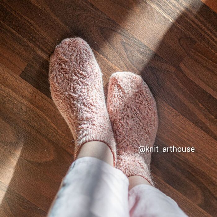 Все нормальные люди носки вяжут из правильной носочной пряжи, где в составе 75 шерсти и 25 чего-то там ещё для лучшей износостойкости вроде как. Но я ненормальная, поэтому мне захотелось носки из мохера. И не просто из мохера, а с тонкой ниткой люрекса. Да и че уж мелочиться, пусть ещё и ажурные будут.