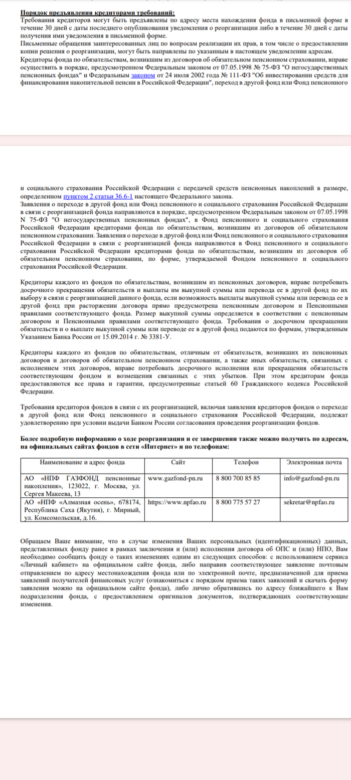 Добрый день. Сегодня пришло такое вот уведомление о реорганизации НПФ. Начал читать, запутался и нихрена не понял. Подскажите, пожалуйста, чем эта реорганизация грозит и что делать, чтобы гроши не пропали?