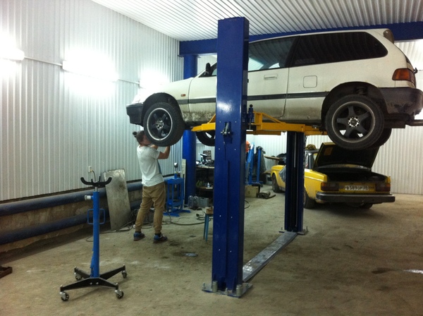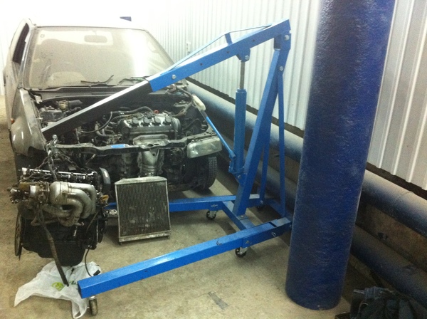 В общем, стукнуло что-то в голову и понеслось. Для начала нужно было купить всякие облегчающие жизнь штуки. Насобирав денег, купил подъёмник, гидравлическую стойку для снятия и установки тяжёлых агрегатов (на фото) [да, для [b]тяжёлых[/b] агрегатов она, наверное, не подойдёт, но кг 150-200 дюжит, проверенно]