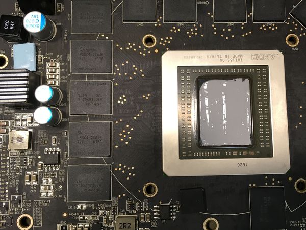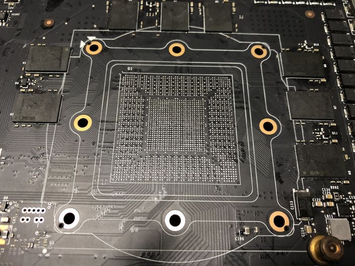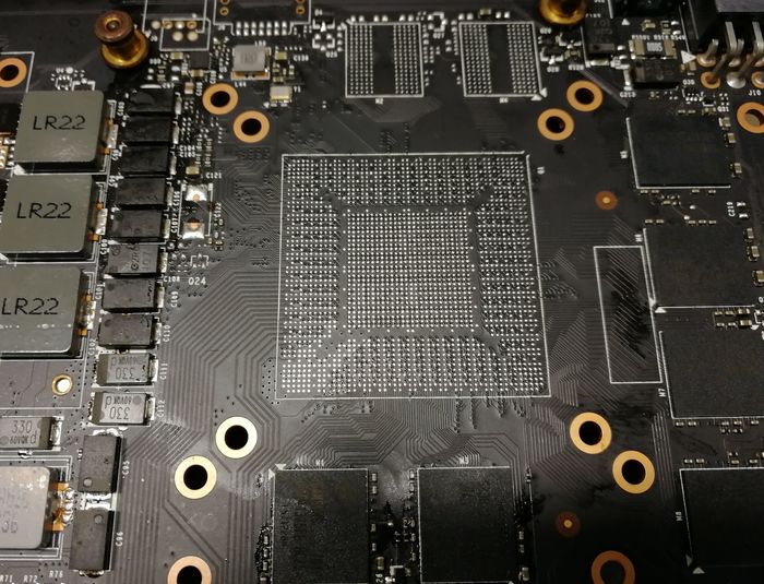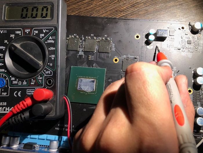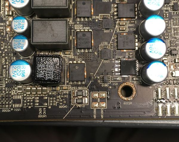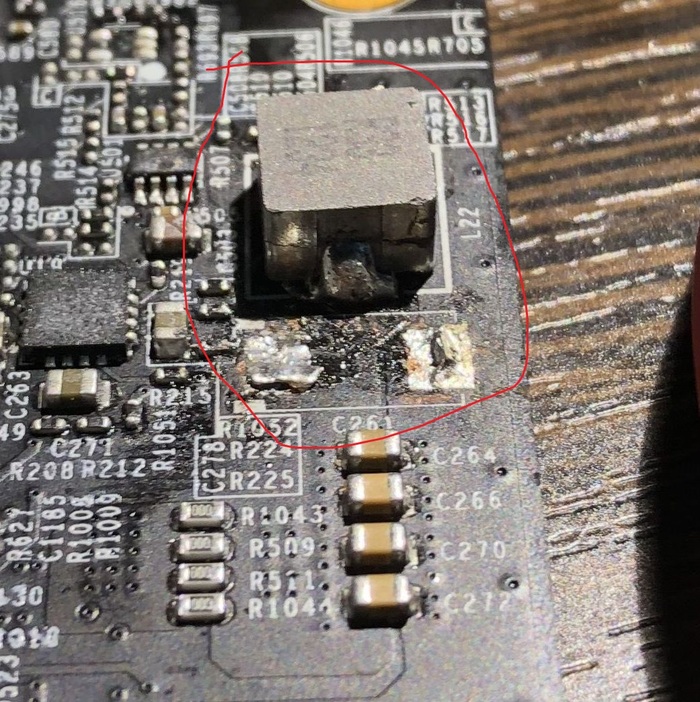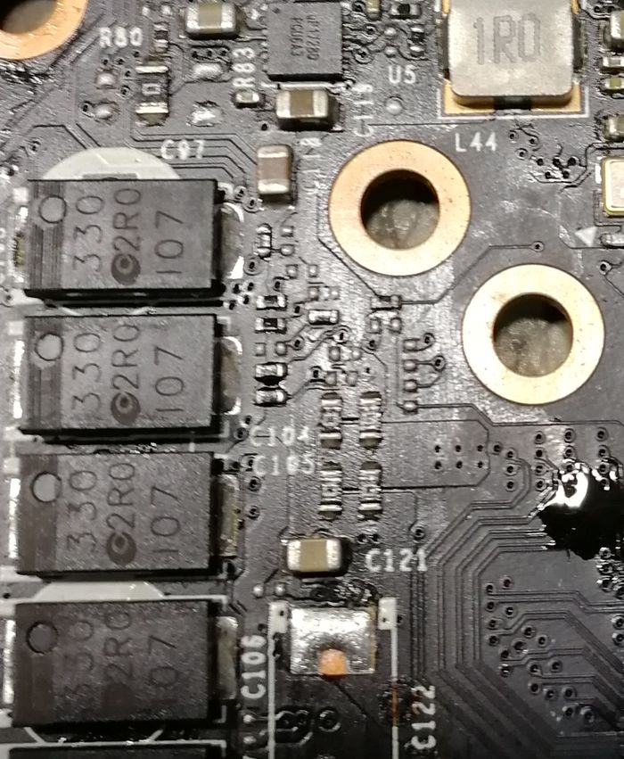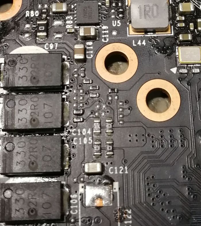 Были оторваны несколько конденсаторов, запаян треснувший дроссель 1.8 вольт, отпаян твердотельный конденсатор сверху возле ШИМа памяти.