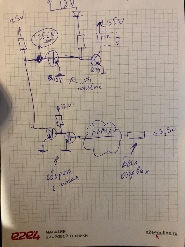 После восстановления резистора, появился сигнал на базе одного из транзисторов шестиногой сборки, следовательно появился и сигнал EN на контроллере питания памяти и появилось само питание памяти.