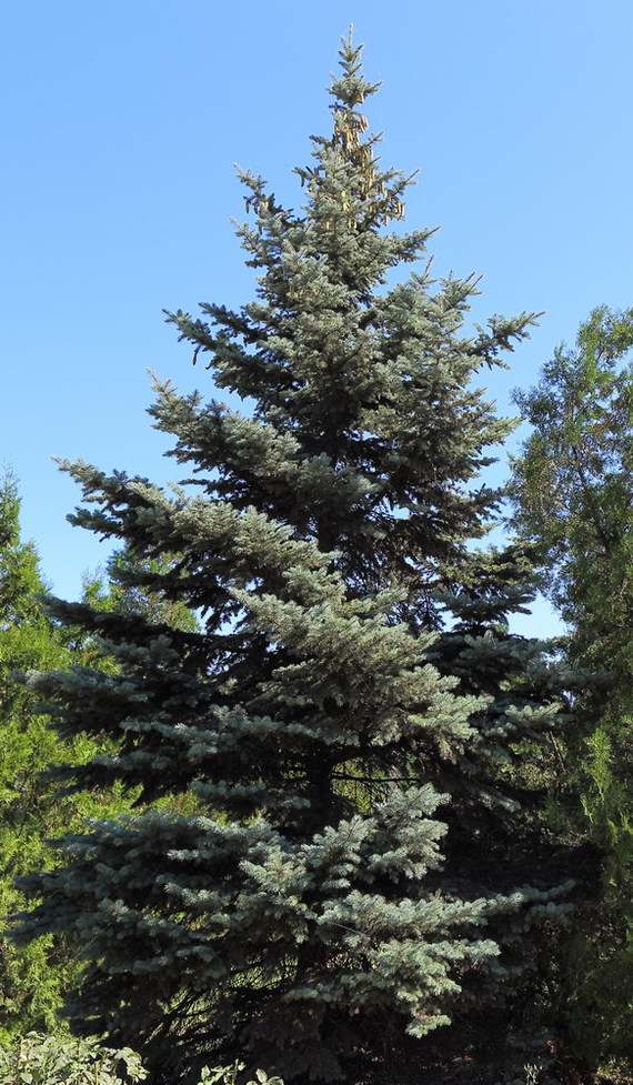 Ель голубая (Picea pungens) очень популярное декоративное дерево, гордость каждой администрации советского города. Ростом 25-30 метров, является обладательницей голубой хвои, цвет которой зависит от толщины воскового налета. Впервые в нашей стране была посажена в Никитском ботаническом саду в 1858 году.