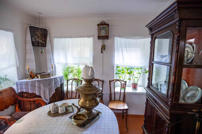 Гостиная самая большая комната в доме служила столовой, гостиной и рабочим кабинетом отца. Здесь воссоздан быт небогатой купеческой семьи.