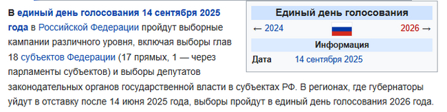 Понадобилось тут узнать, какие выборы планируются в 2025 году. Зашел в Яндекс. Первыми ссылками были страницы Википедии. Ну, не самый достоверный источник, но мне и не нужна стопроцентная достоверность. Первая страница была российская википедия, вторая - переведенная буржуйская. Вторая оказалась интереснее. После просмотра я решил, что буду участвовать в выборах. И вот почему: