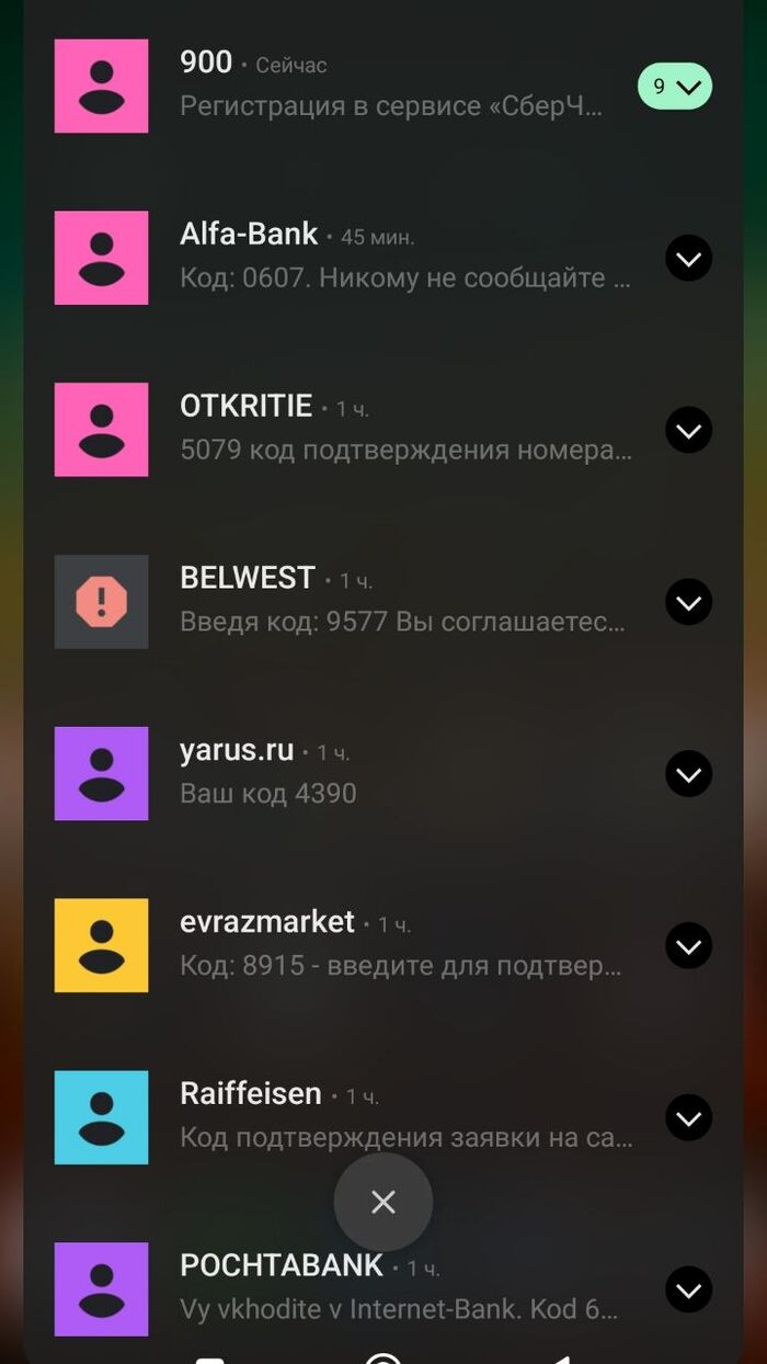 Скрины СМС- и пуш-оповещений прилагаю (в них отражены не все транзакции).