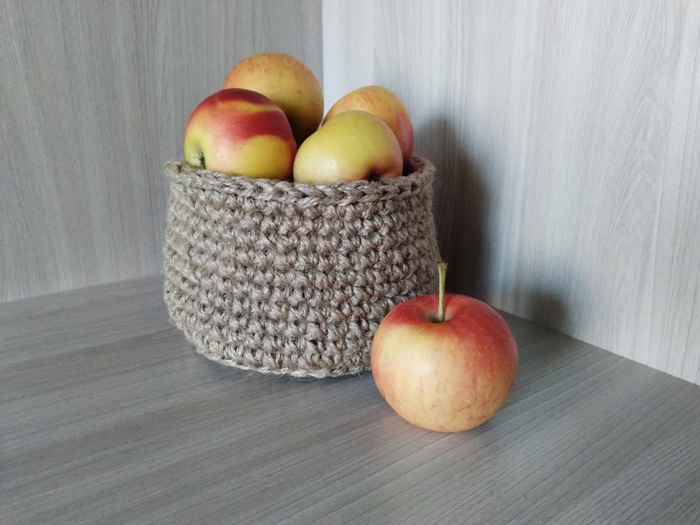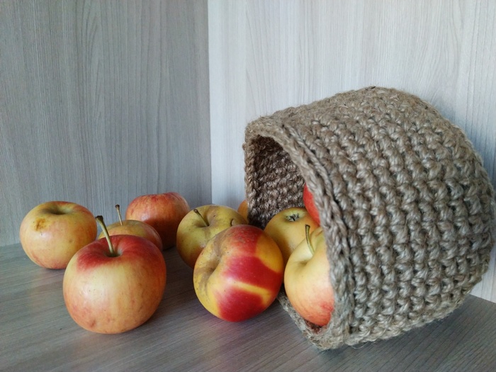 Деревянная заготовка обвязывается столбиком без накида по всему диаметру. Во втором ряду добавляется канат и тоже ввязывается столбиками без накида, вязание происходит по спирали, до необходимой высоты изделия. Заключительный ряд обвязывается полустолбиками.