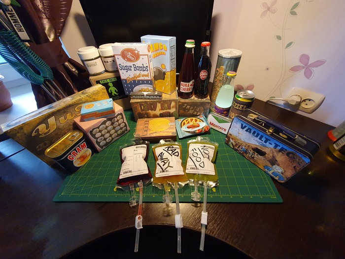 Вооружившись гугл-таблицами и фандомом по 4 Фолу, в любую свободную минуту на работе я начала расписывать себе план. Главным списком вещей от которого я отталкивалась, была страница “Медпрепараты и еда Fallout 4”, так как естественно это проще всего воспроизвести. Тупо брала весь список, просматривала его и оставляла то, чему могла придумать реальный аналог. При этом обязательно занося в таблицу все варианты и идеи, чтобы не забыть, потому что изначально даже самая кажущаяся тупой идея может в итоге преобразоваться в что-то гениальное.