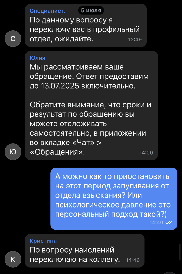 Заявку продлевали 4! раза. Всё это время мне звонит отдел взыскания, теперь я по одному "Здравствуйте!" могу определить, звонит живой человек или робот. Сотрудников скоро по голосам начну различать. Кажется, они превысили допустимое количество звонков (не чаще 2 раз в неделю или 8 в месяц), потому что звонили постоянно, пару раз доводили до слез и давили угрозами пойти в суд. Они пугали меня тем, что посмотрят камеры с банкомата (НЕТ, НУ ВЫ ПРЕДСТАВЛЯЕТЕ? я и так прошу их это сделать уже 1.5 месяца, а они пугают ежа голой жопой, но, видимо, не могут найти сотрудника с глазами, чтобы это сделать).