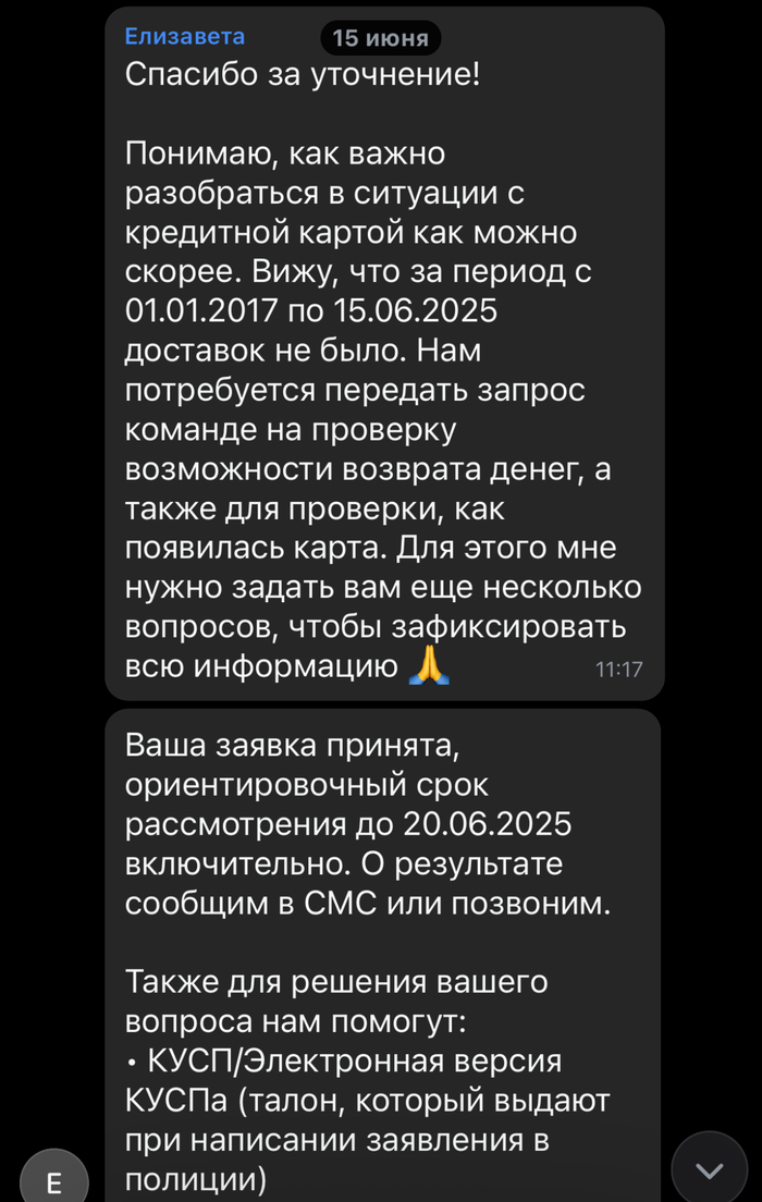 Прекрасная оператор Елизавета пишет мне, что за период с 01.01.2017 и поныне доставок не было. После этого Елизавета оформила заявку на возврат денег и проверку, как карта вообще появилась.