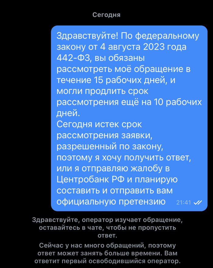 Сегодня истек разрешенный срок для рассмотрения заявки (информирую вас, 15 рабочих дней с момента заявки, и можно продлить ещё на 10 рабочих дней, но дальше всё). В связи с эти я напишу заявку в ЦБ РФ, составлю досудебную претензию в Т-Банк и буду готовиться к войне. Т-банк, вы взрастили во мне столько ярости, что я планирую биться до конца. Я положу на это всё, но своего добьюсь. Даже если мне придется потратить сумму, сравнимую с долгом, на адвоката, даже если у меня не останется времени на сон, любой ценой. И начинаю я с этого поста. Да будет бой!