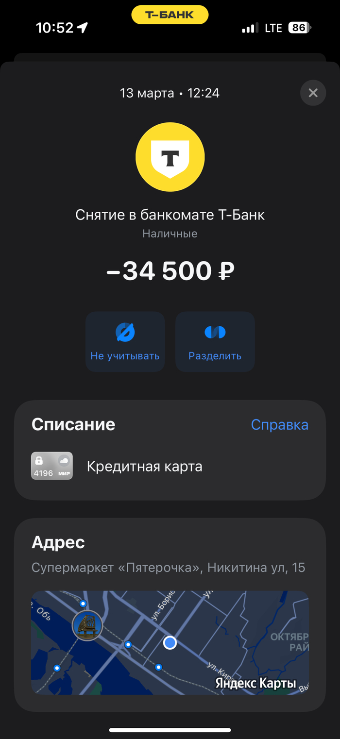 На счёт я впрочем посмотрела, а точнее, на его историю. Никаких движений по нему, за исключением оплаты в кафе «Горчица» и затем снятия ВСЕЙ СУММЫ С КРЕДИТКИ ПОД НОЛЬ ОДНОЙ ИТЕРАЦИЕЙ в городе Новосибирск в марте этого года.