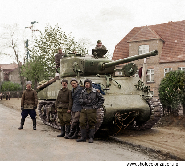 179 kostas26 Моя колоризация 8 лет назад Советский танк "Шерман" в немецком городке Грабов, Германия 3 мая 1945 года Показать полностью 2 [моё] Колоризация Танки Великая Отечественная война Шерман