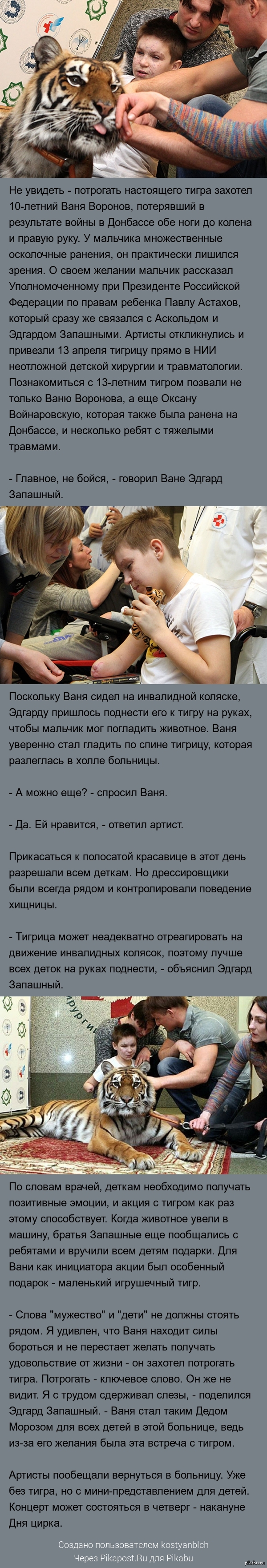 kostyanblch 10 лет назад Братья Запашные привели тигрицу в больницу к Ване Воронову http://www.kp.ru/daily/26366.5/3247767/ Показать полностью 1 Украина Война Дети Не политика Иван Длиннопост