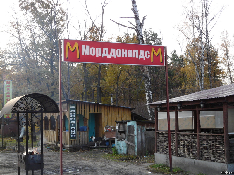 14 kostyanz 12 лет назад Морддоналдс По пути из Пензы в Москву, на трассе М-5, можно встретить это необычное кафе. Макдоналдс нервно курит в сторонке) [моё] Картинки и фото