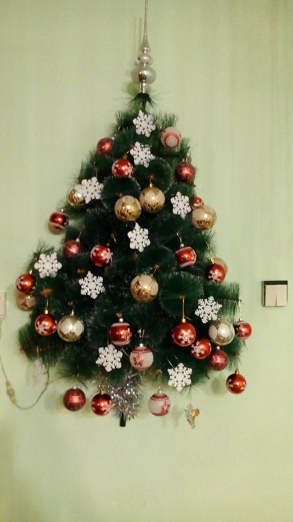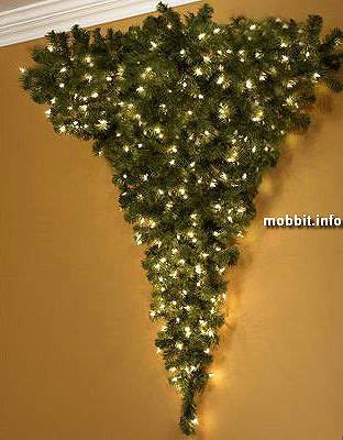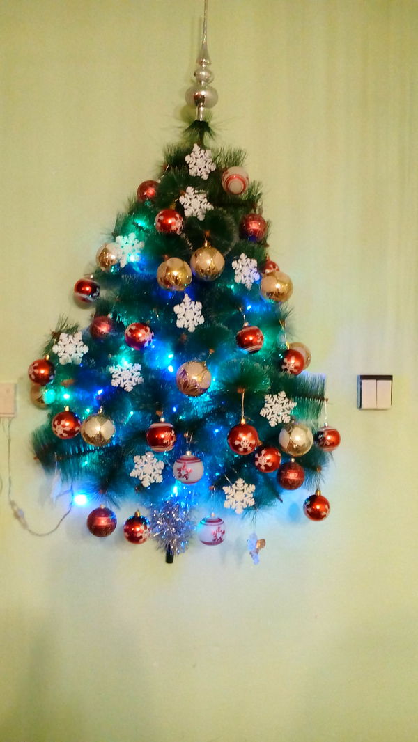 Но хотелось чего-то получше, поинтереснее. Да и елку все же хотелось, какой новый год без елки? Это как новогодний стол без тазика оливье и мандаринов. И решили мы, что быть елке на стене. Полезли в интернет, искать варианты настенной елки. Нашли елку на потолок: