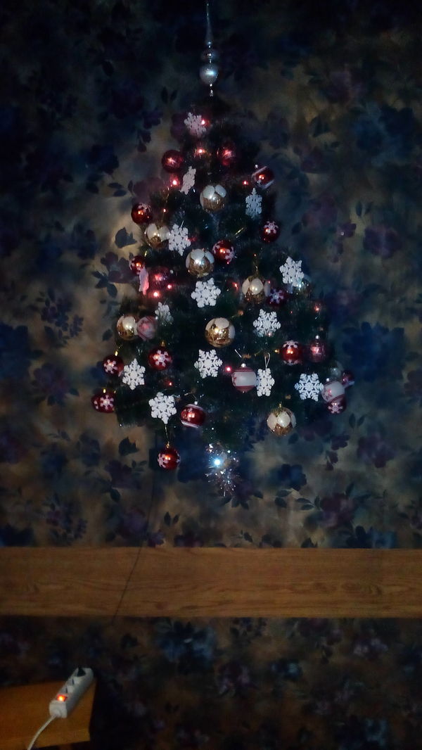 В этом году мы снимаем уже другую квартиру и в ней нету светлой и пустой стены. Пришлось вешать на стену с темными обоями. Смотрится похуже, но тоже не плохо