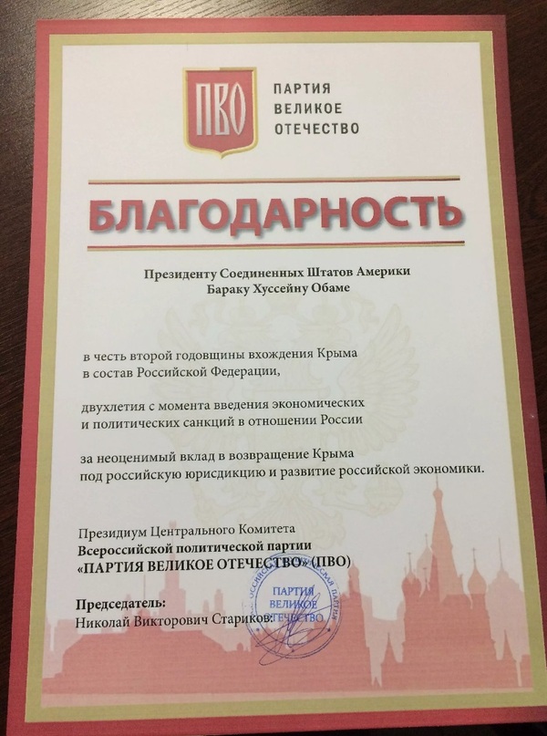 В честь второй годовщины вхождения Крыма в состав Российской Федерации Президиум Центрального Комитета Партии Великое Отечество направил благодарственные письма в адрес Президента Соединенных Штатов Америки Бараку Хуссейну Обаме и главе Госдепартамента США Джону Форбсу Керри. Наша партия благодарит первых лиц Соединенных штатов за неоценимый вклад в возвращение Крыма под российскую юрисдикцию и развитие российской экономики.