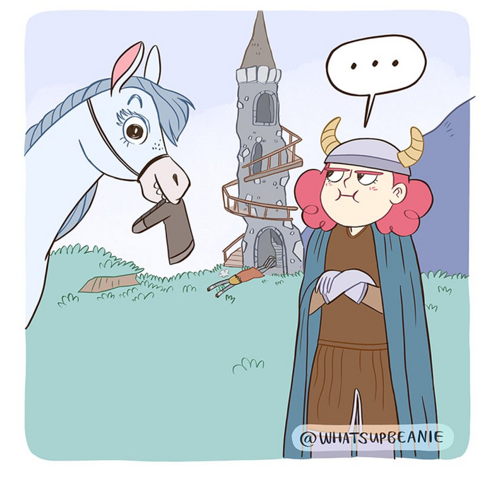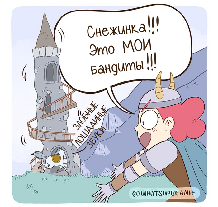 Комментарий автора: Игроки в Скайрим, поднимите руку! Меня всегда веселит то, насколько храбрые лошади в этой игре. Моя лошадь, которую я с любовью называю Снежинкой, много раз бежала впереди меня, чтобы сражаться с драконами.