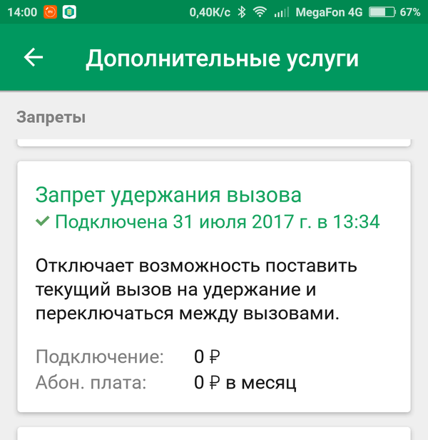 Позвонила дочка (сейчас в деревне) с телефона сестры. Баланс её телефона -6.50 рублей, позвонить не может. При подключении номера были отключены ВСЕ платные услуги. После звонка в контактный центр выяснилось, что вчера была подключена услуга "Кто звонил" (1.5 рубля в день) и было удержание вызова (5 рублей за раз). Услугу отключили, 1.5 вернули без вопросов. И тут самое интересное: