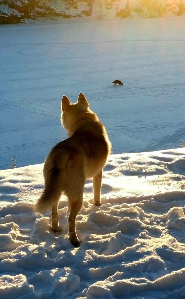 Огибаем дом, впереди светофор, где зелёный, туда и пойдём. Арагорн и Лилу бегут вперёд, иногда путаются если Арагорн оказывает девочке знаки внимания, но в целом, они быстро подлаживаются друг под друга, и я чувствую, что вместе они тянут меня о-го-го как, там, где под снегом на тротуаре лёд, я просто качусь, чтобы не полететь носом вперёд, как сегодня в начале дневной прогулки. На проспекте Ленина немного застреваем. Энтузиастов быстро на зелёный пересекли, а вот тут горит красный свет и нужно стоять, ждать. Зато Лилу учится переходить дорогу по команде, а не тогда, когда хочется бежать.