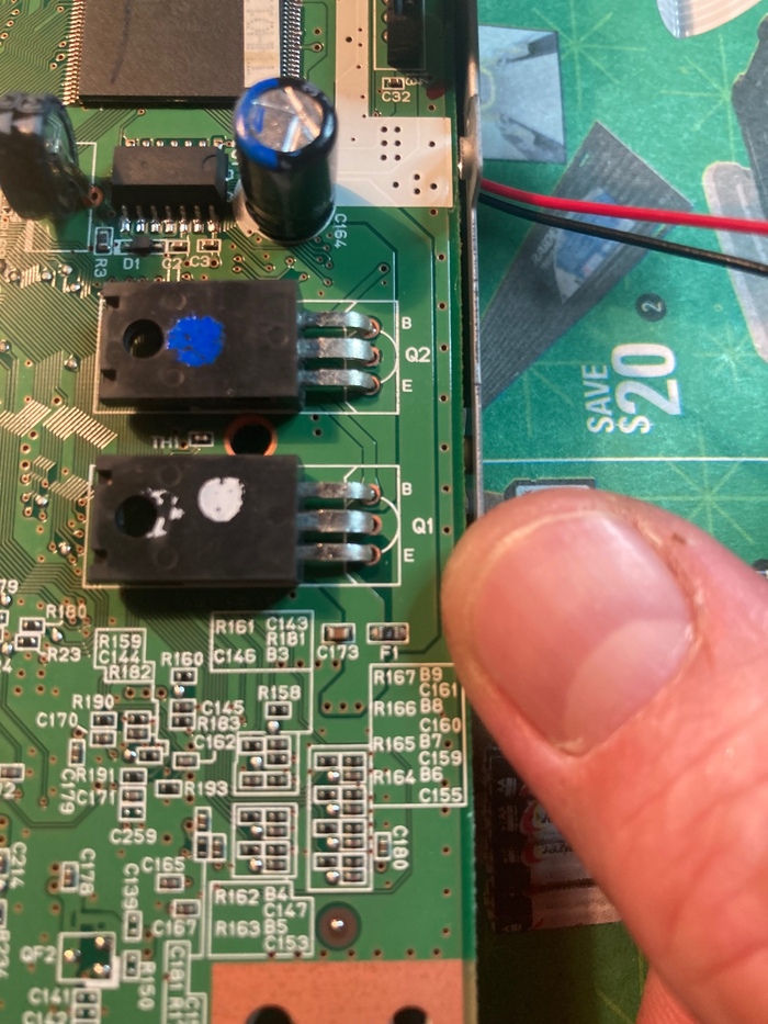 Ну вот таким прозвонил откуда и куда. Выпаял живой транзюк и начал впаивать в рабочую плату. Изматерился! Скальпелем зачищал дорожки, но они, сволочи, не хотят деждать пайку. А инструментов нормальных у меня нет! Короче, с помощью какой-то матери сделал соплю- дорожку и от неё уже стал плясать. Самый маленький паяльник из четырёх был 30 ватт. Жало ну совсем не похоже на то, которым паяют мастера ремонта Pikabu. Ну не тазики лудить, но и не волосяные дорожки паять. Однако как-то умудрился припать этот гадский транзистор. Выглядит похабно, но ОНО РАБОТАЕТ!