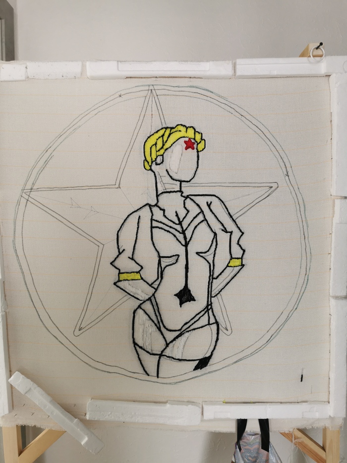 Попробовать делать коврики заинтересовал как раз-таки Пикабу. В голове быстро закрутился готовый образ - аккурат конец февраля и выход нашумевшей игры, откуда у близняшки ноги и растут. Картинка была нарисована заранее из нескольких референсов, но подвела доставка ткани - две недели я ходила вокруг материалов, как кот вокруг сметаны, аж сны снились, как работа над ковром кипит.