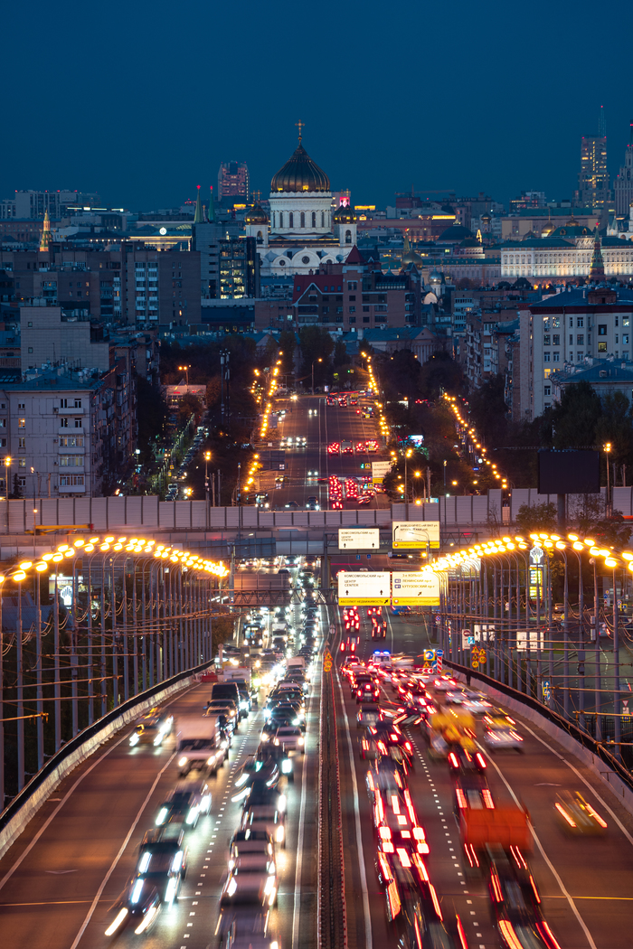 Снимок сделан сквозь опоры Бережковского моста, с правого берега Москвы-реки. Сделал много дублей, чтобы поймать наиболее красивые треки от проезжающих автобусов.