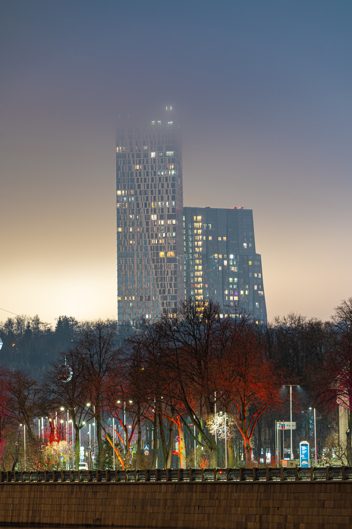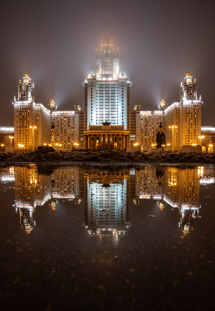 Шатаясь намедни по Хамовническому валу (Дефолт-сити) решил перейти реку через Андреевский пост, чтобы неспешно дойти до Кремля по Парку Горького и Якиманке. Все эти планы отвалились, когда я посмотрел в место, где привычно располагается МГУ. Вместо 240-метрового гиганта сквозь низкую облачность пробивалась жалкая полоска света по нижней границе здания. Пришлось всё бросать, идти в сторону метро и ехать до универа. За часик наснимал там всякого, и вот, делюсь с вами.