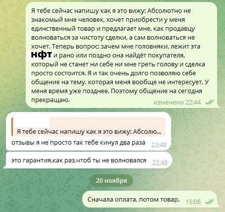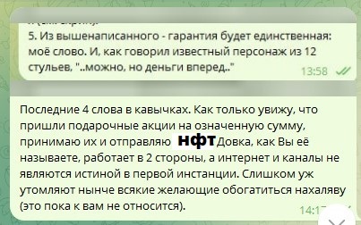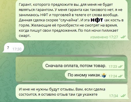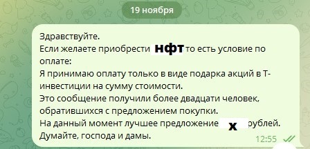 Грешным делом подарили мне в телеге НФТ. Я ими никогда не занимался и не собирался, т.к. мне это чуждо и не нужно. Сразу после этого начались сыпаться предложения в личку от потенциальных покупателей. Когда они меня задолбали, я написал один пост и отправил им всем