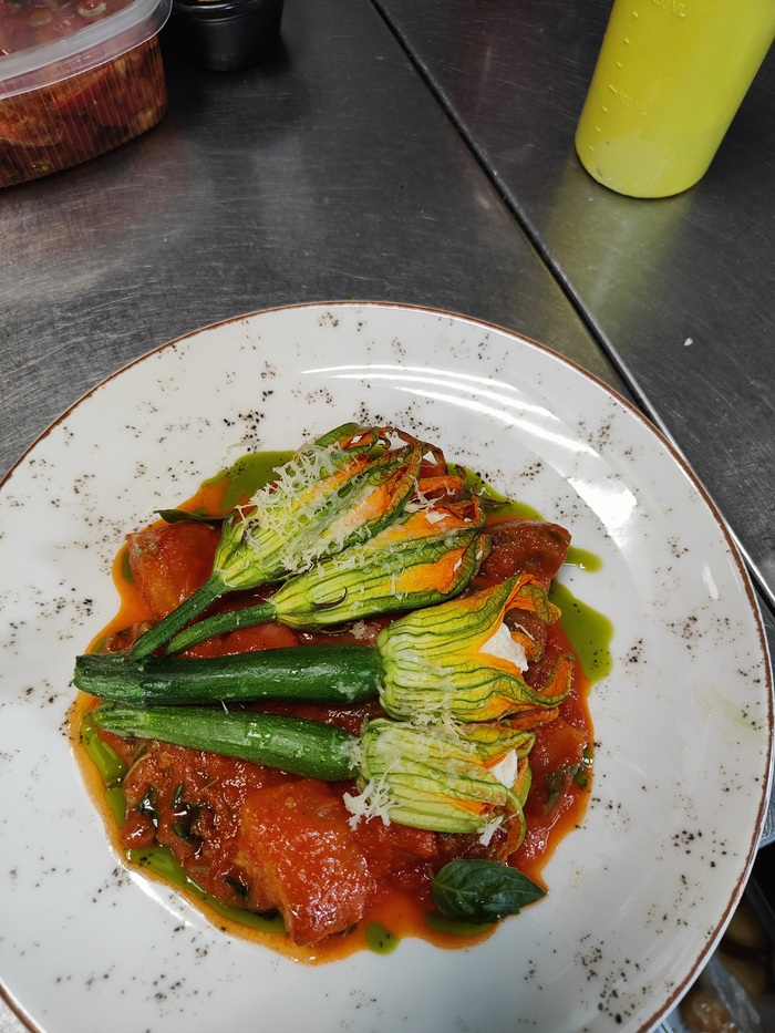 Фаршированные, надуги и пармезаном, молодые цукини с цветами, с соусом из фермерских томатов