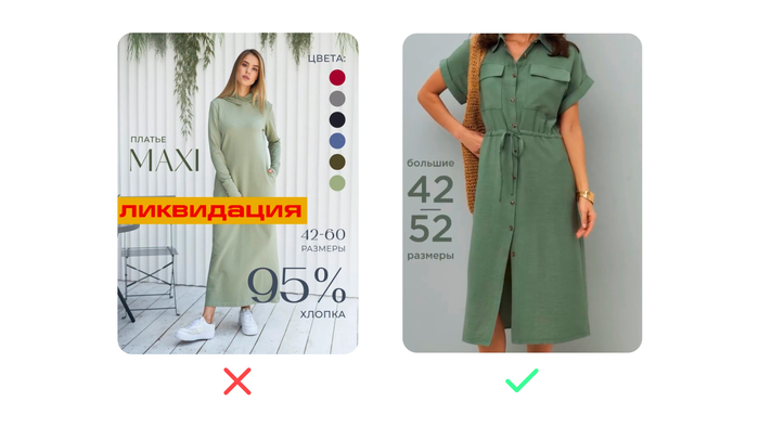 Будьте лаконичны. Главный смысл должен читаться за секунду. Например: «100% хлопок», «Удобный крой», «Для детей с 3 лет».