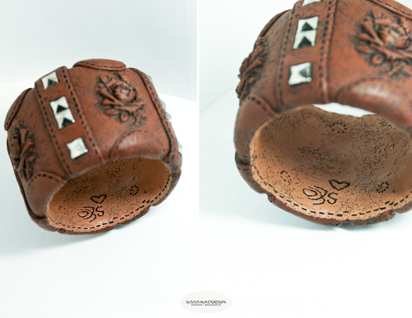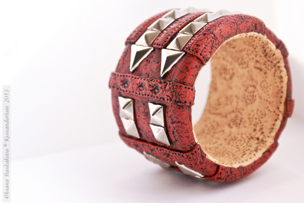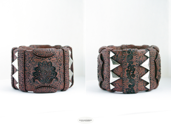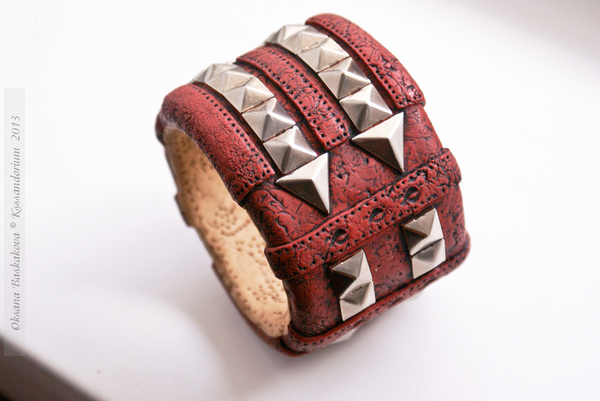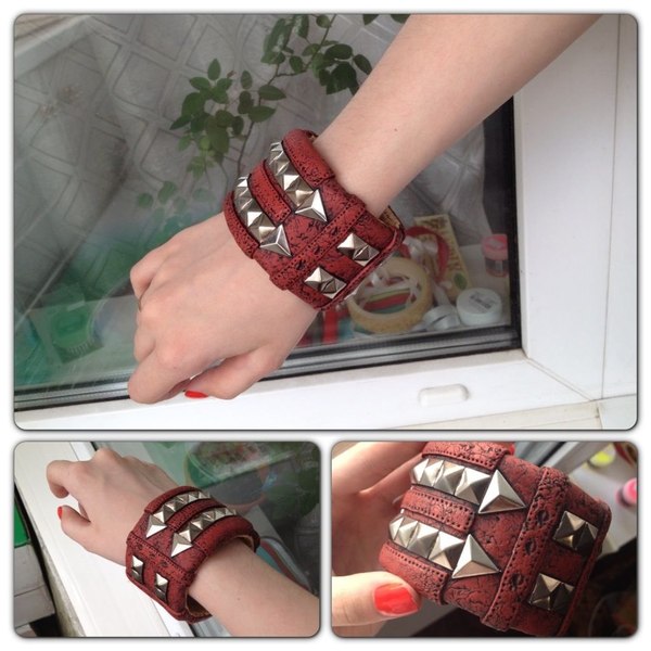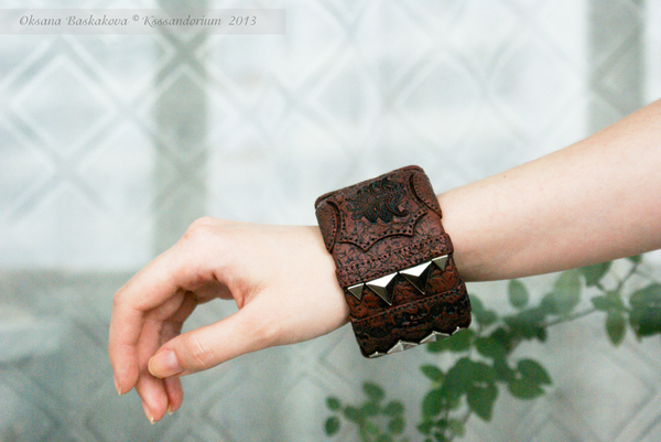 Браслет декорирован клёпками, а так же имитацией тиснения узоров на кожу горячими штампами.