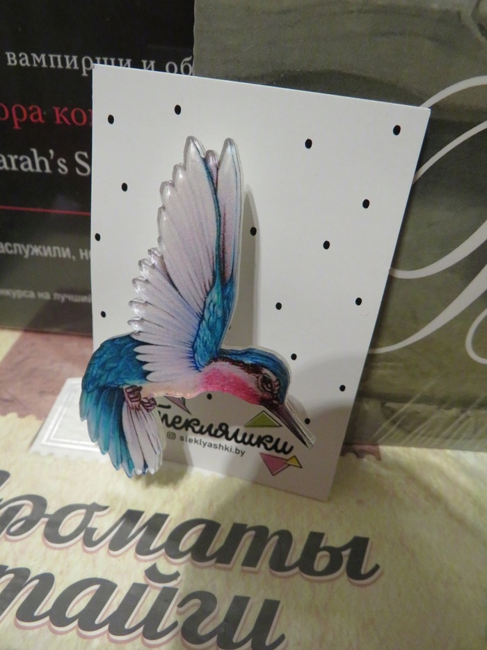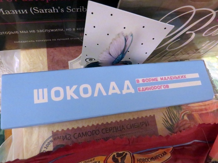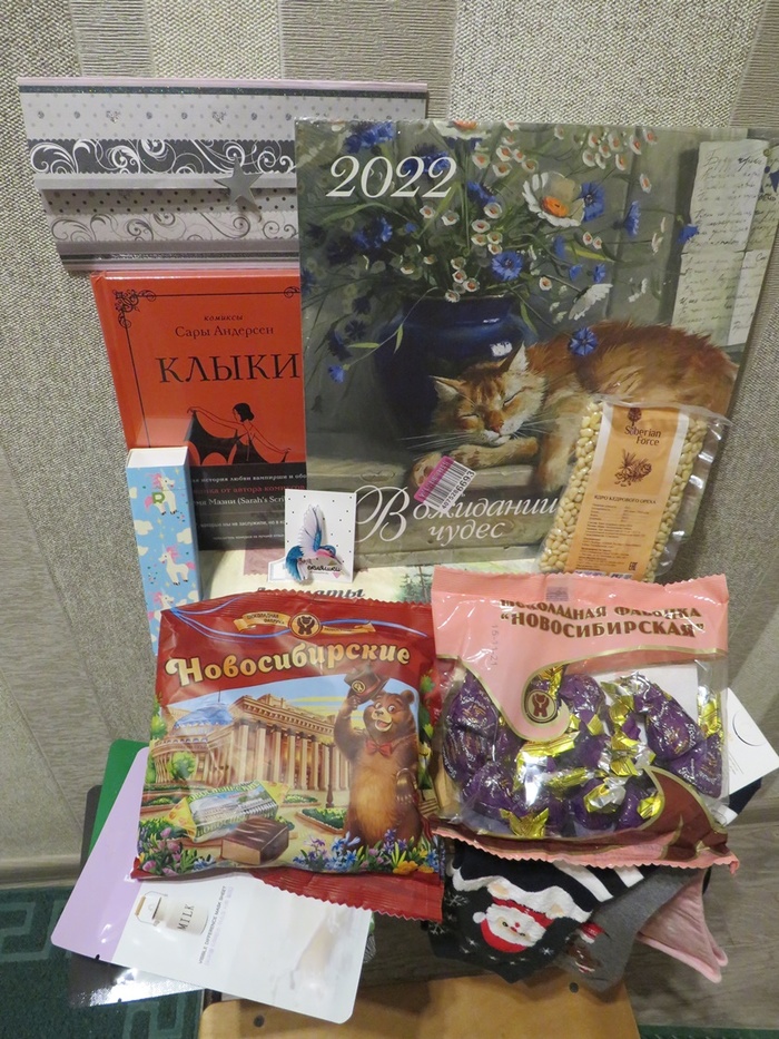 В подарке были комиксы Сары Андерсен "Клыки", большой настенный календарь на 2022 год, кедровые орешки, 2 пакета конфет местной шоколадной фабрики "Новосибирская" - Сибирские и Пралинэль, большая коробка 4-х видов натурального травяного алтайского чая "Ароматы тайги", 3 разных маски для лица, 3 разноцветных пары носков с новогодними рисунками, совершенно потрясающий значок-брошка Колибри, коробка цветных шоколадных единорожиков, и собственноручно подписанная красивая складная открытка.