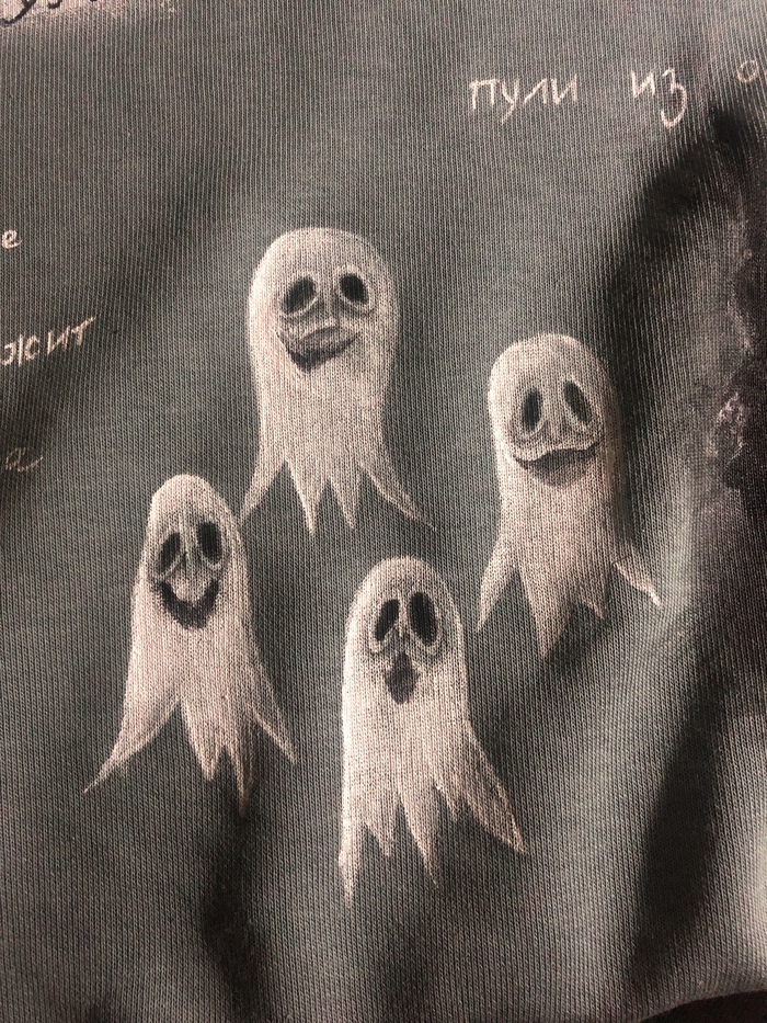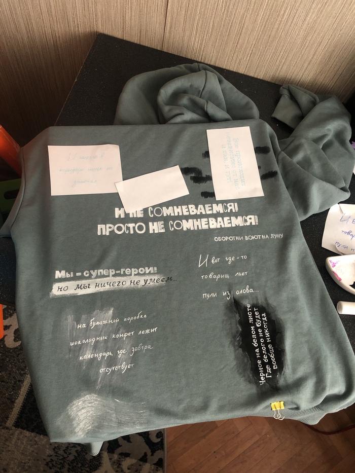 В процессе некоторые блоки передвигали по несколько раз, чтобы при носке слова не уходили в подмышки или, наоборот, спрятались под капюшоном