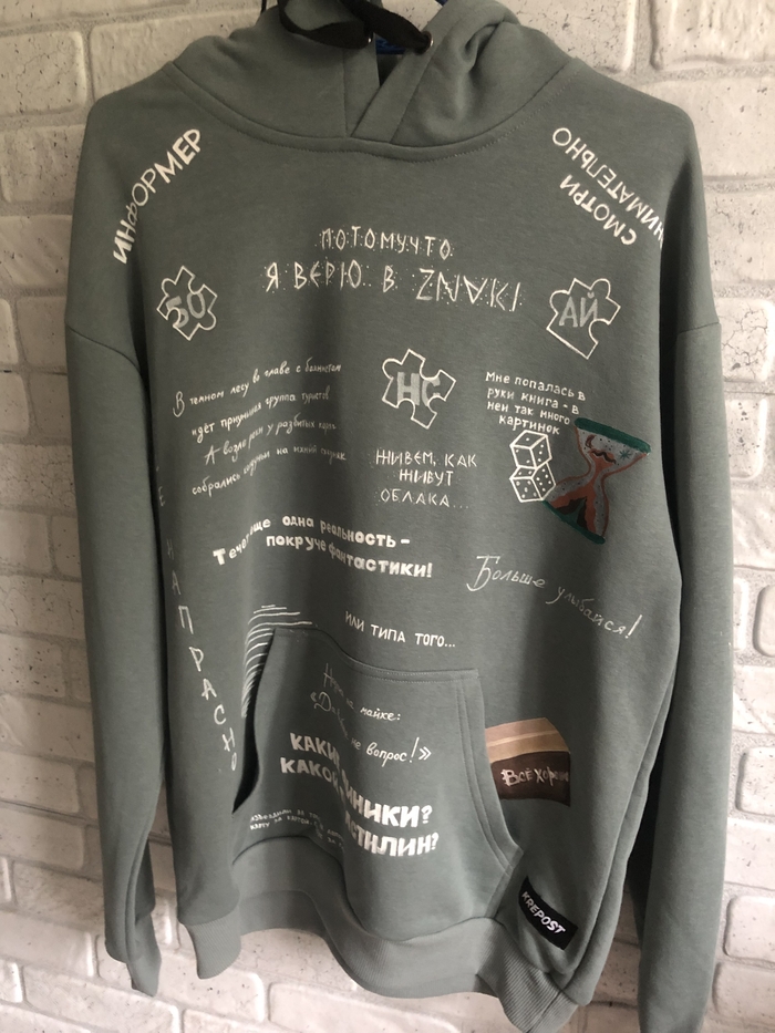 Короче, есть у меня постоянный заказчик и она является фанатом групп Потомучто и Znaki 👍🏻 и она сделала заказ на роспись худи с любимыми цитатами из песен