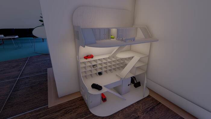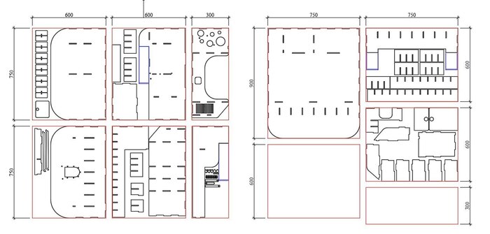 Так как я проектировщик со стажем, решено было начать с чертежей. Но на этапе разработки рабочей документации пришла гениальная мысль делать 3D-модель, снять с неё развертки и отдать на лазерную резку по фанере. Итак, размеры места под парковку сняты, средние габариты машинок померяны, делаем модель и простенькую визуализацию: