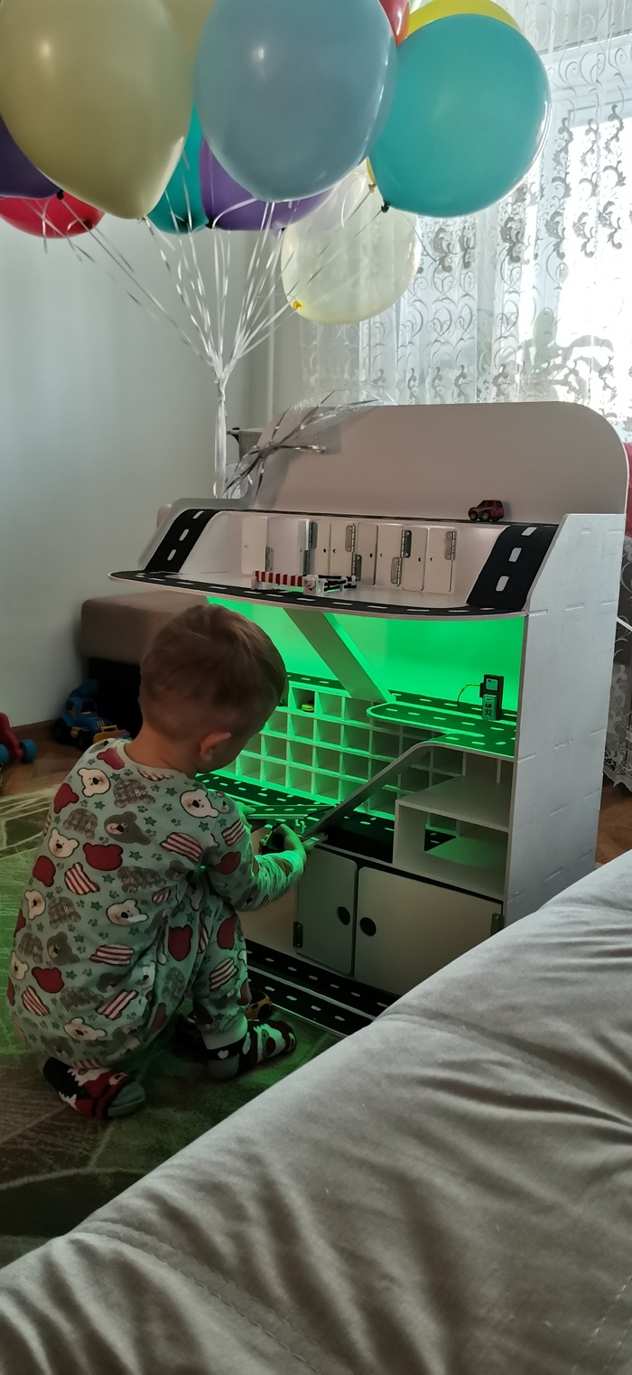 К слову, парковка получилась очень прочная - на верхнем ярусе спокойно стоит ребёнок 20кг, Горка посередине работает как раскос у фермы😁