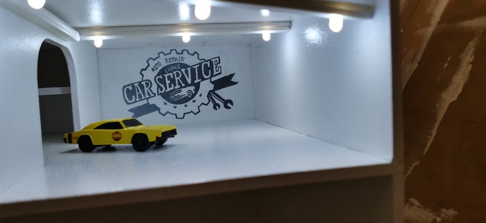 Из электрики - RGB-лента, контроллер с пультом, куча дешёвых диодов для гаражей и трансформатор на 9В для них, два моторчика для автомойки, 5 метров проводов и кнопки включения. Ещё кабель канал, чтобы спрятать ленту. Всю электрику спрятал под правую верхнюю горку и вывел сзади провод на 220В. С электрикой я на Вы, поэтому делал долго и матерясь с помощью YouTube