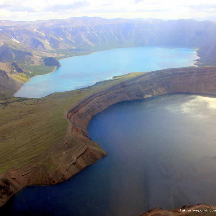 бирюзовое озеро в кратере вулкана в иллюминаторе вертолета.