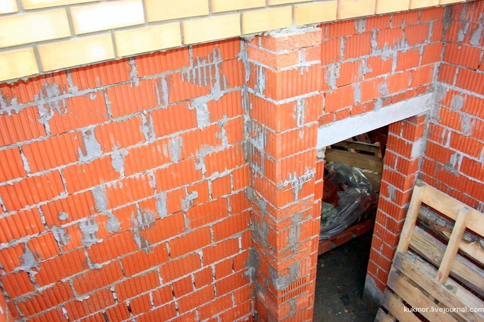 7. На стенах, на которые будут опираться плиты для более равномерной нагрузки сверху уложены два ряда кирпича, который использовался в цоколе и всем запомнился необычным узором, который многие приняли за трещины.