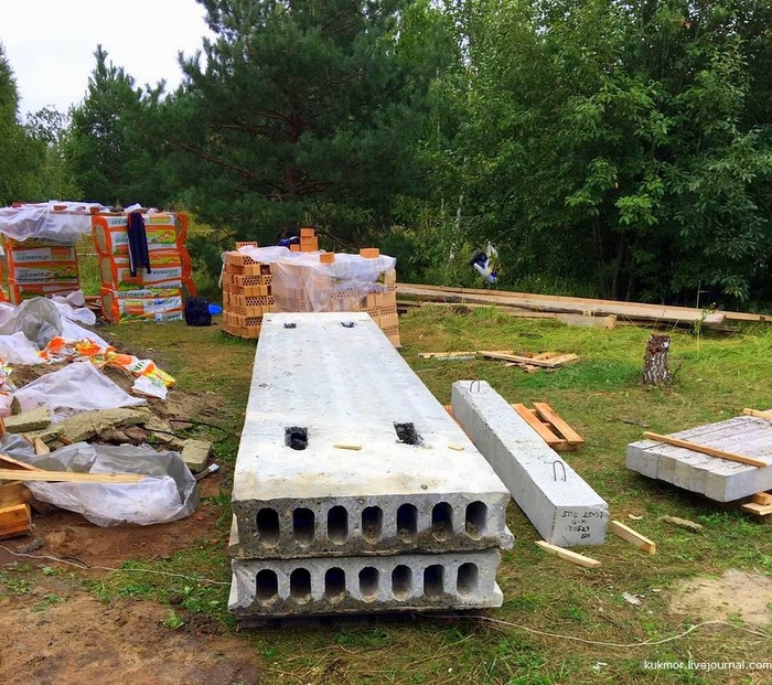 14. Вчера привезли бетонные плиты перекрытия между этажами. Погода внесла свои корректировки и их положили не сразу, а запланировали это на завтра, но обо всё этом в следующей серии!