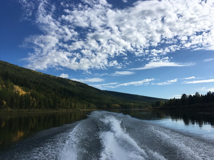 В новой командировке предстояло заниматься батиметрией – съёмкой рельефа подводной части реки Лена. Объект располагался в Иркутской области, в районе малодоступного посёлка Коношаново. Добрались без приключений, используя все виды транспорта. Самолёт- перелёт до Иркутска, джип – дорога из Иркутска в Жигалово и лодка – из Жигалово в Коношаново. Теоретически и до Коношаново есть дорога, но фактически проехать по ней в незимний период не представляется возможным. Виды по пути были весьма неплохи.