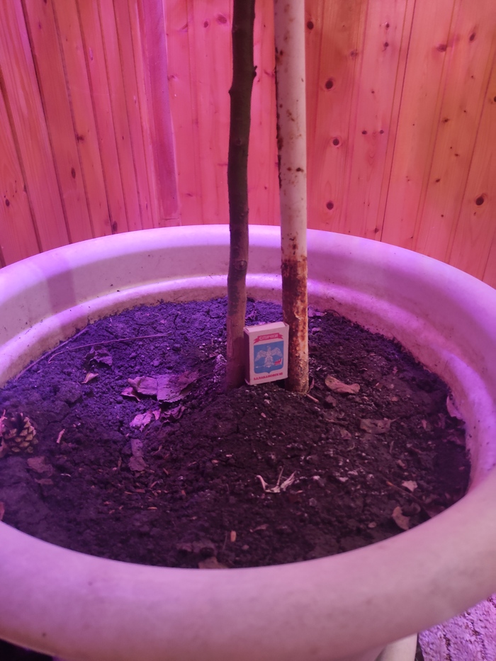Прошёл ещё 1 год жизни моего дерева, делюсь, если вдруг кому интересно. За весну-лето-осень на улице, прирост, по моему мнению, колоссальный. По фото видно, дерево занесли на то же место. Для масштаба добавил спичечный коробок. В принципе, заморозок дерево пережило без особых проблем, поэтому в этом году держал его на улице по максимуму, занесли его в дом 10.11