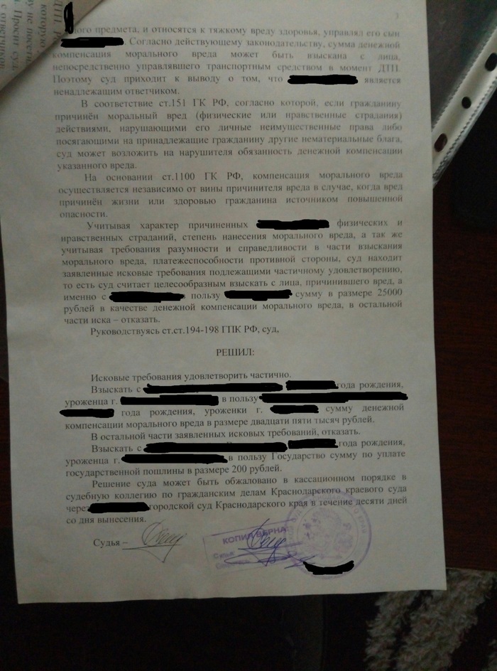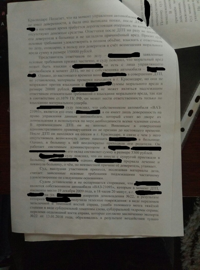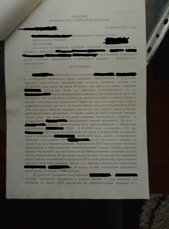 Мы нанимаем адвоката, и начинаем готовиться к тяжбе.В суде женщина изображала из себя бедного потерпевшего, говорила о временной потере трудоспособности, ей дали инвалидность 3 степени на 1 год, уверяла в том, что ее никто не посещал в больнице и вообще, мы такие плохие, а она такая бедная. Ее адвокат настаивал на возмещении материального вреда - санаторно-курортное лечение + временная потеря трудоспособности и морального вреда (цифры сколько чего не помню). Т.к. в ДТП моей вины не было, судья сразу отклонил часть иска о материальном ущербе и удовлетворил только моральный, частично, в размере 25 000 рублей. Она пыталась подать в суд на отца, как на владельца авто, но судья ей объяснил, что это не юр. лицо, нет никаких договоров, и она 100% ничего не получит. После нам обещали апелляцию, но было достигнуто соглашение - мы отдали 40 000 рублей, и на этом все закончилось.