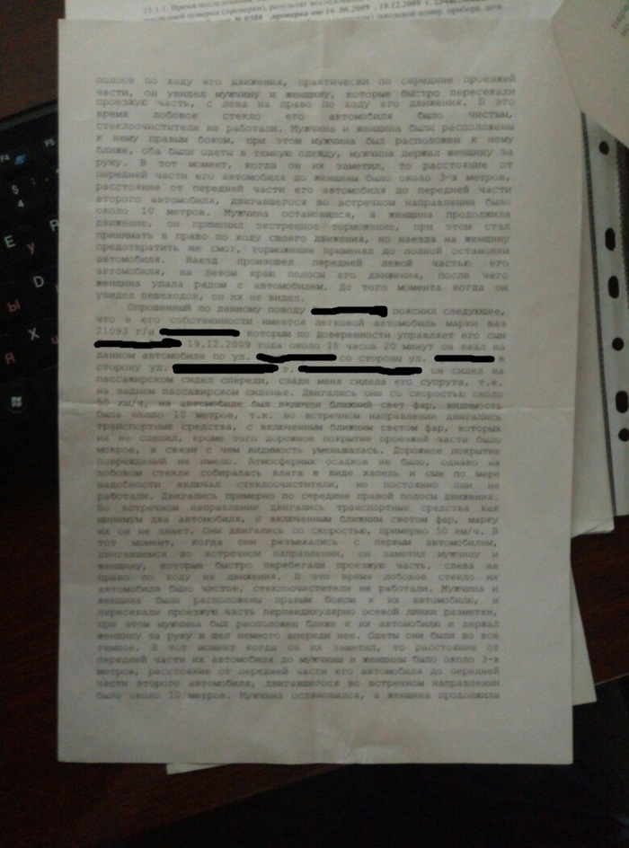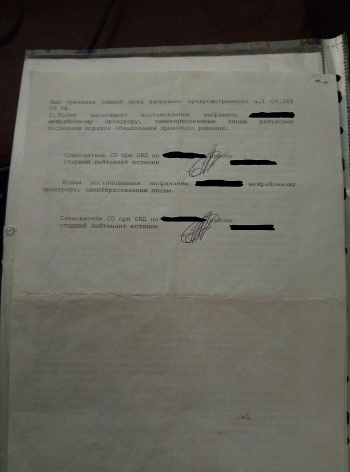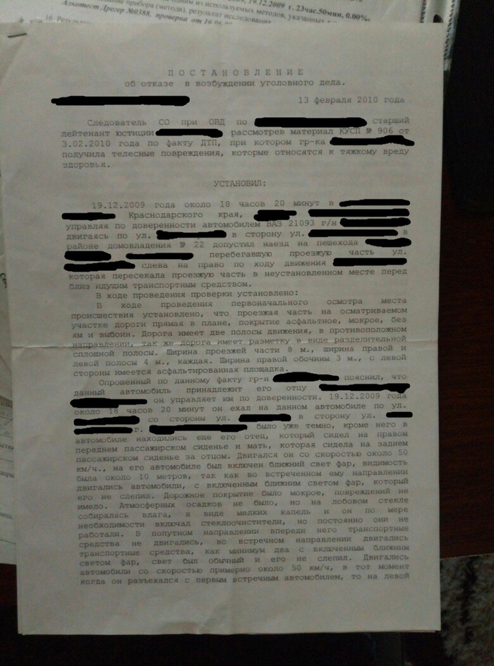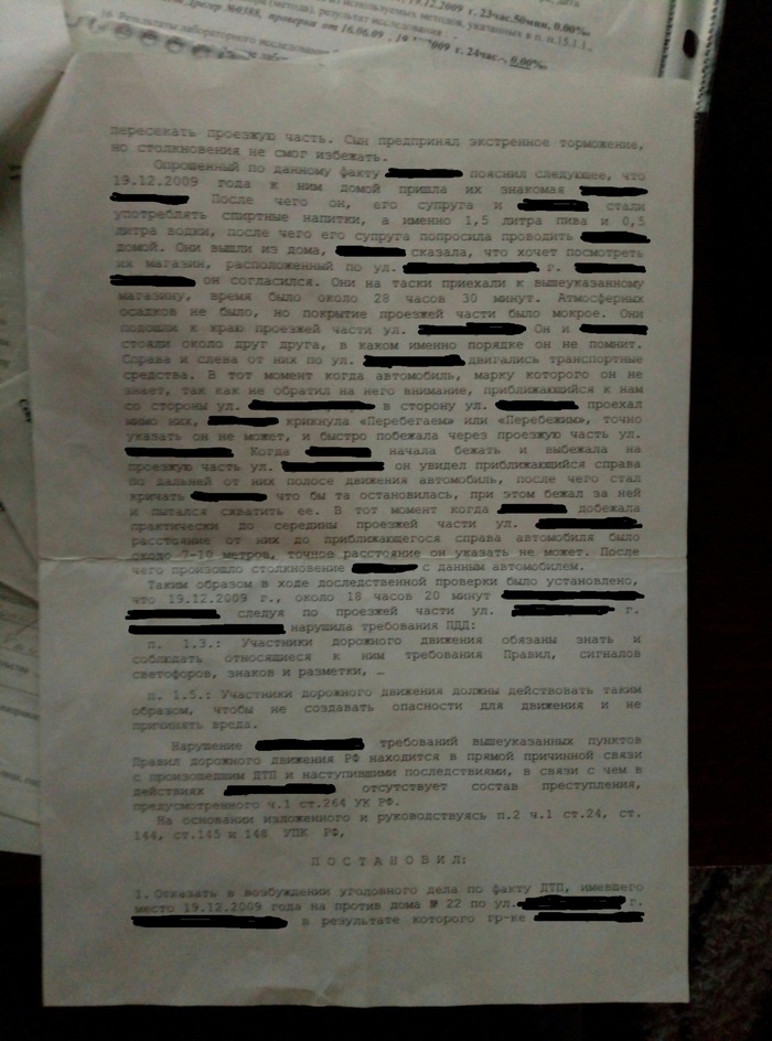 На следующий день, нас сутра вызвали в тогда еще милицию, там дали почитать материалы ДТП, записанные не от руки, а напечатанные на принтере, дали расписаться в протоколе, и отдали нам копию. В протоколе следователь отобразил, что я не имел технической возможности избежать ДТП, следовательно, в возбуждении уголовного дела было отказано. Нас отпустили домой, и сказали ждать.