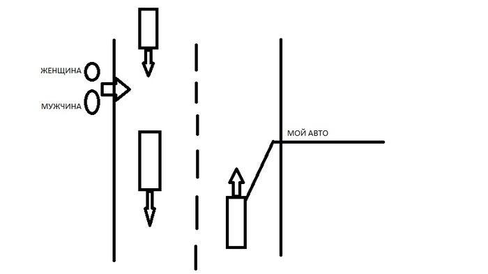 Мужчина и женщина, оба пьяные, решили перебежать дорогу в неположенном месте мне под колеса, мужчина был более трезвый, и он вел женщину за руку, меня он увидел и остановился, а она - нет. Как итог - она выскочила из-за него мне под колеса. Смотрим схему