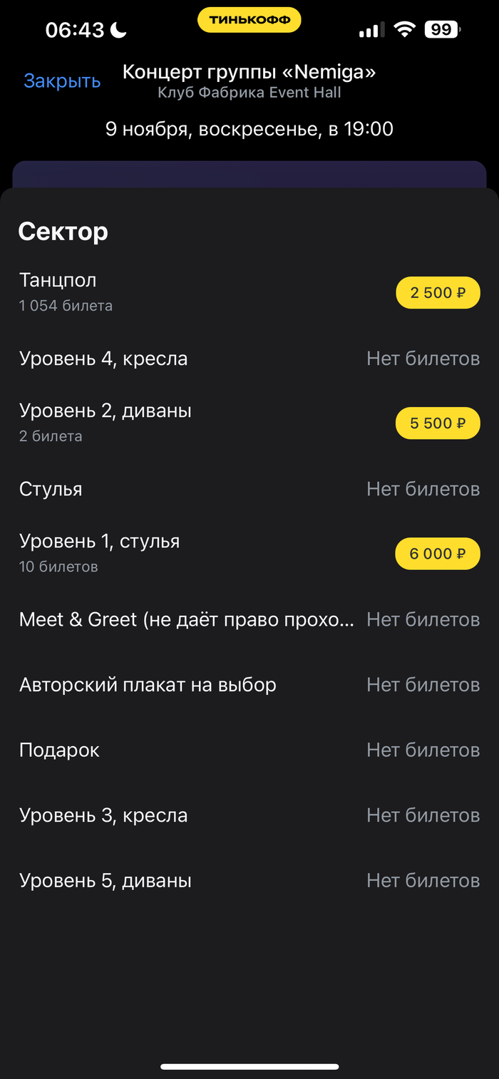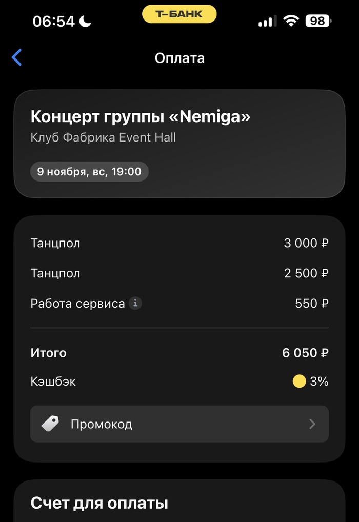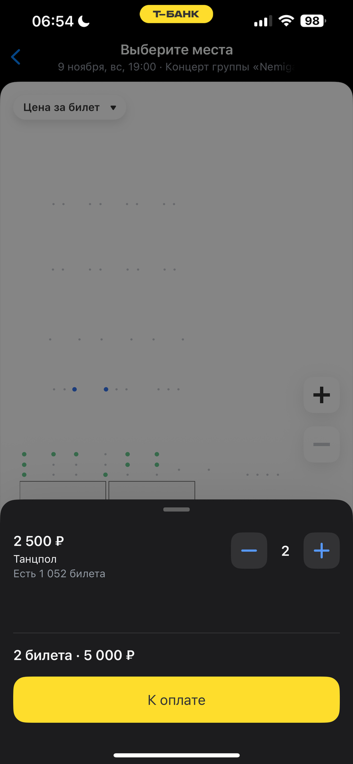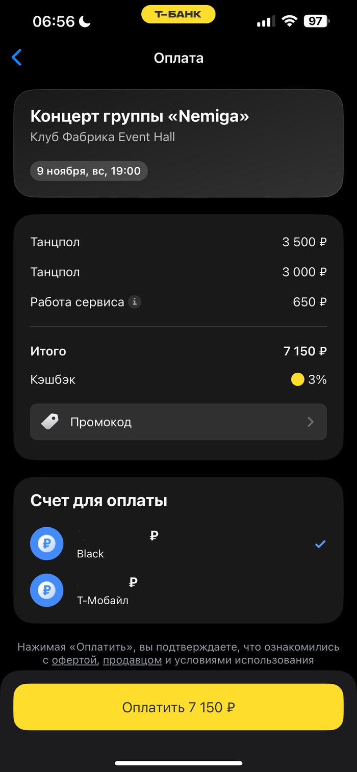 Решила купить билеты на концерт пока в ТБанке хороший кешбек на Афишу. Выбрала, чуть не нажала оплатить, не ожидала такого подвоха - при заявленной цене билета 2500р на этапе оплаты она менялась как угодно - 3к, 3,5к, 2,5к, разная цена на два одинаковых билета. Хотела в поддержку написать, но она висит уже часа три во всех приложениях.