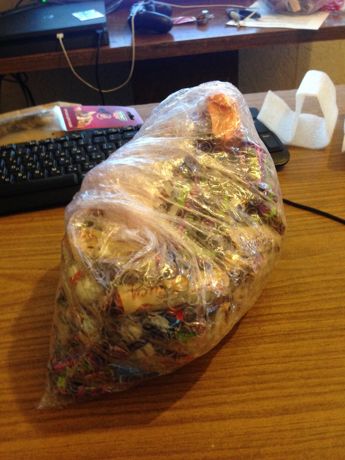 Начнем со сладкого. Просто огромный мешок конфет. Ну я же и так толстый))