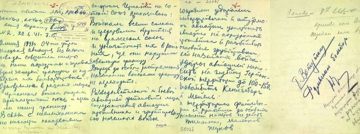 Внимания также заслуживает рассекреченная копия рукописного Боевого приказа народного комиссара обороны № 2 от 22 июня 1941 года, собственноручно составленном начальником Генштаба РККА Георгием Жуковым спустя три часа после начала войны — в 7:15 утра.