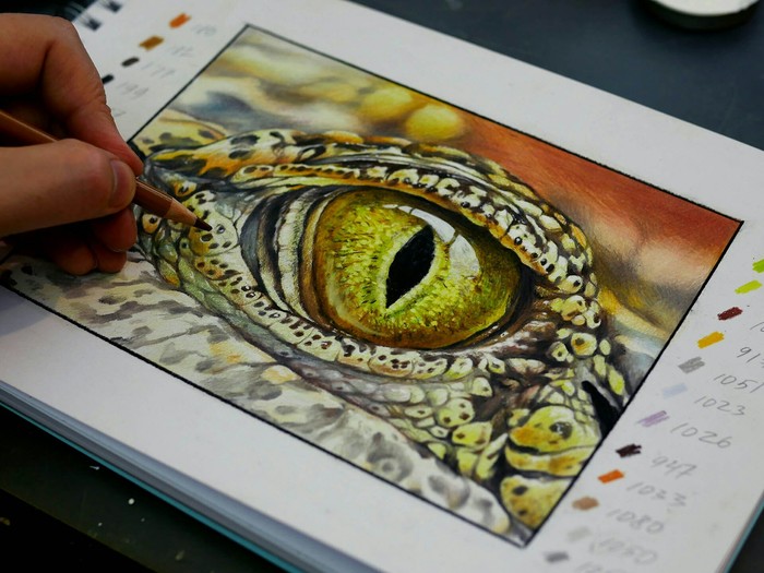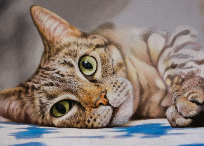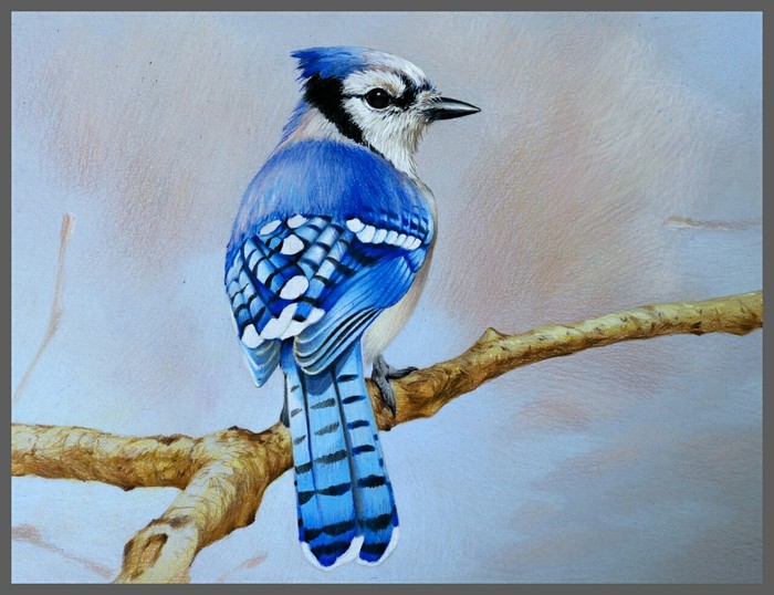 В работе использовал карандаши Prismacolor и белый акрил.